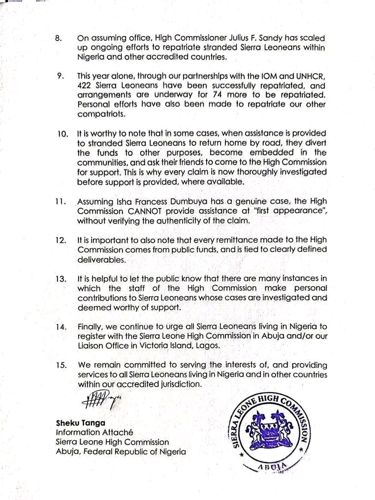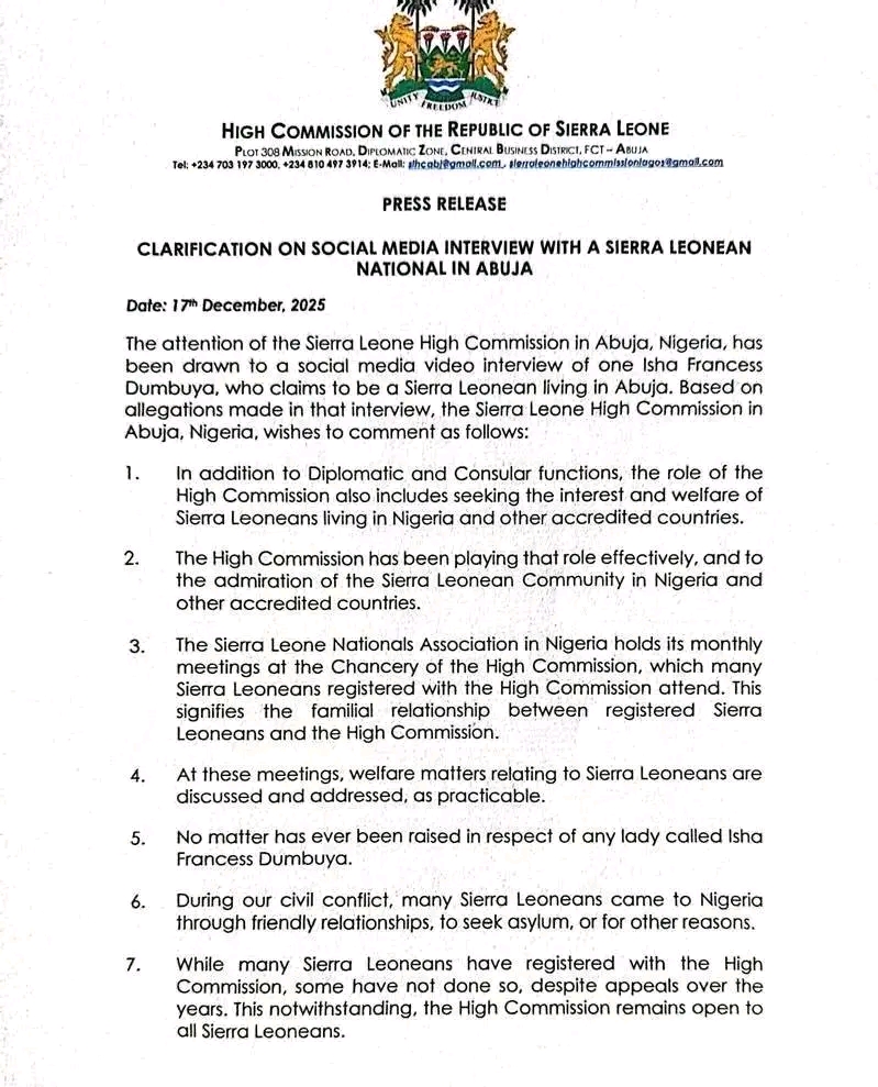 The Sierra Leone High Commission in Abuja has responded to a viral social media video in which a woman, Isha Francess Dumbuya, claims to be a Sierra Leonean living in Nigeria and alleges mistreatment by the Mission.