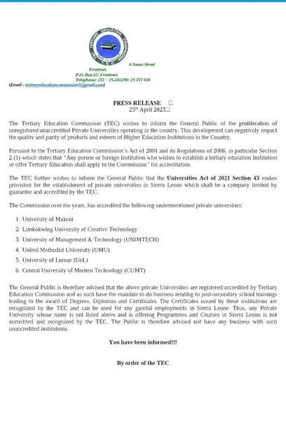 The Commission in a press release stated that the University Act of 2021 section 43 makes provision for the establishment of private universities in Sierra Leone which shall be a company limited by guarantee and accredited by the TEC.