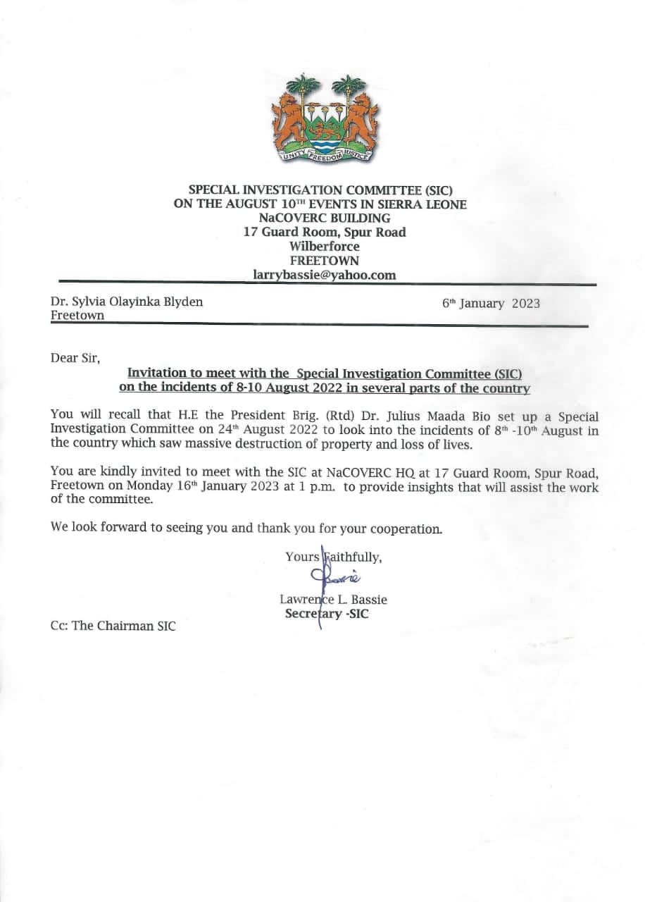 A letter addressed to Dr. Blyden, states that she has been invited by the SIC to help in providing insights that will assist the work of the committee.