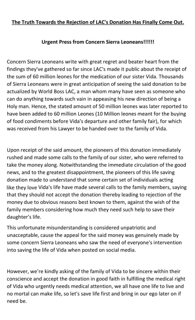 Few days ago, LAC pledged to donate 50 million Leones for Vida’s medical treatment. He promised to pay her transportation fees where ever she wants to travel to and also offers 5 million Leones to the family of Vida. After making his promise, he made the 60 million Leones available for Vida’s medical treatment through popular blogger and promoter, Sana Jay Salone.