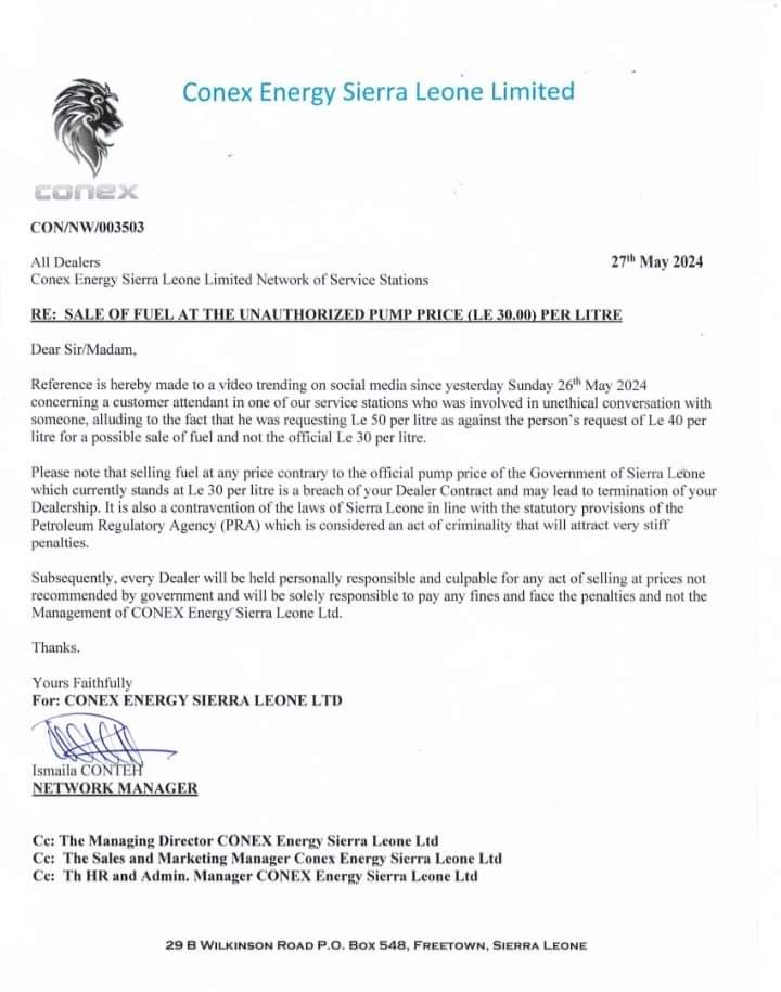 The statement, titled “Sale Of Fuel At The Unauthorized Pump Price (Le 30.00) Per Litre,” was sent to all Conex service station dealers. It references the video and emphasizes that Conex operates under the mandate of the Sierra Leone government.