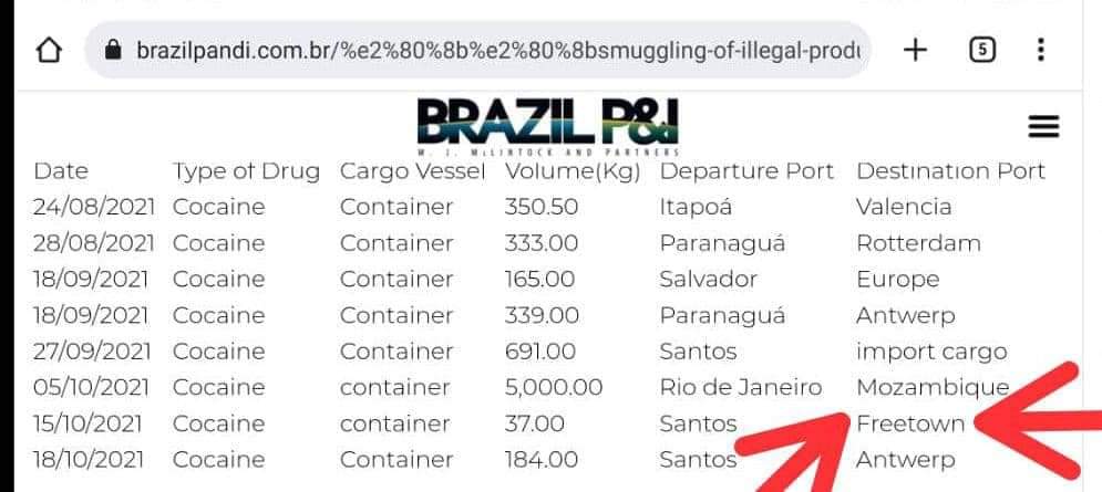 They include official data from Brazil Police about a container with 37 kilograms of cocaine that was intercepted at the Brazil shipping ports last year on 15th October 2021, already bound for Freetown, Sierra Leone. This shows the movement of Cocaine between Brazil to Freetown in sea containers is not new.