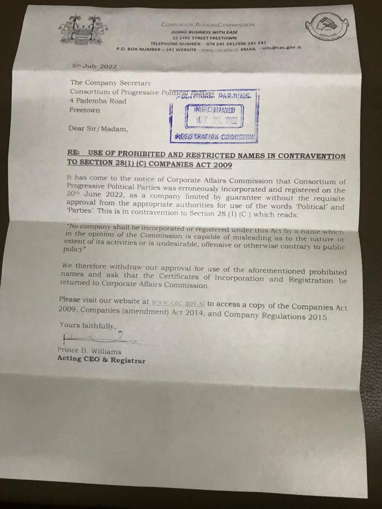 In the statement, the Consortium of Progressive Political Parties was registered as a company limited by guarantee without the requisite approval from the appropriate authorities for the use of the words ‘Political’ and ‘Parties’, which the statement says is in contravention of section 28(1) C of the company Act.
