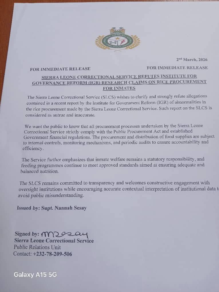 The Sierra Leone Correctional Service (SLCS) has strongly refuted allegations of financial impropriety in its rice procurement contracts, pushing back against a recent report by the Institute for Governance Reform (IGR) that suggested millions of Leones may have been misspent on feeding inmates.