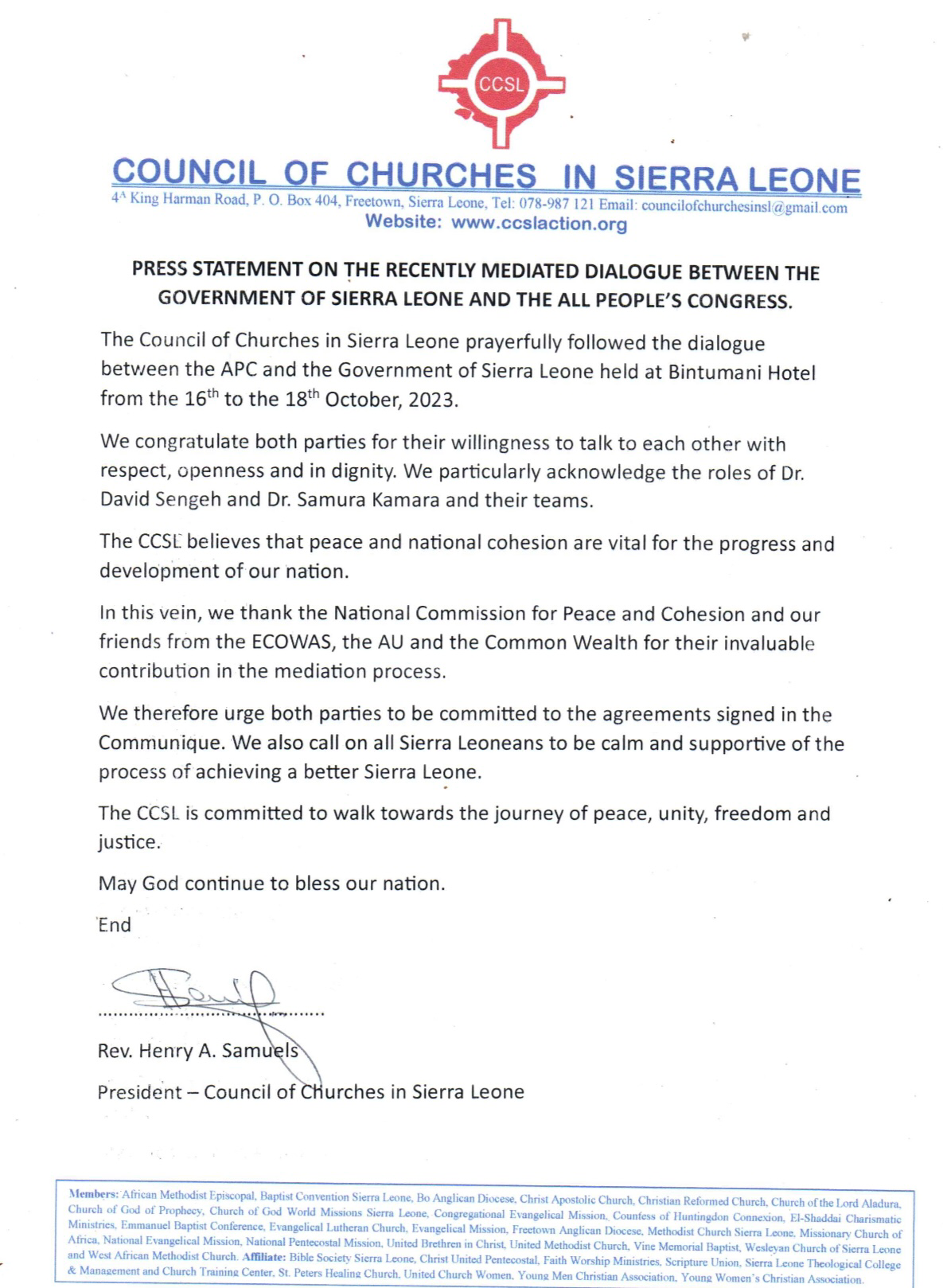 In a statement released today, the Council of Churches in Sierra Leone (CCSL) prayerfully followed the recent dialogue between the All People’s Congress (APC) and the Government of Sierra Leone, held at Bintumani Hotel from the 16th to the 18th of October, 2023.
