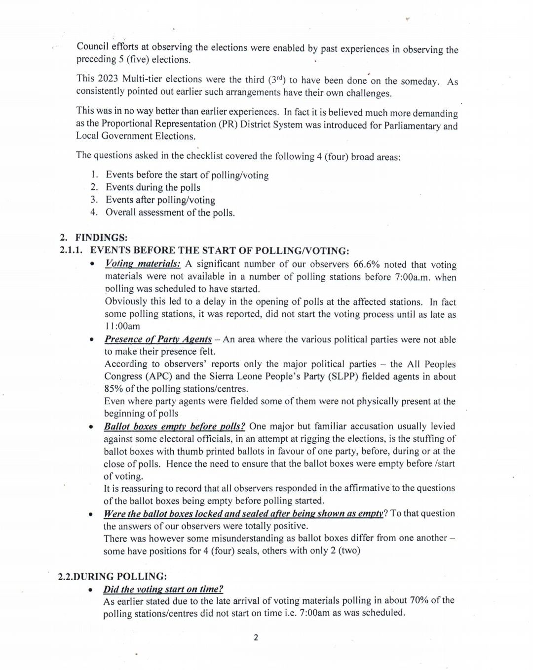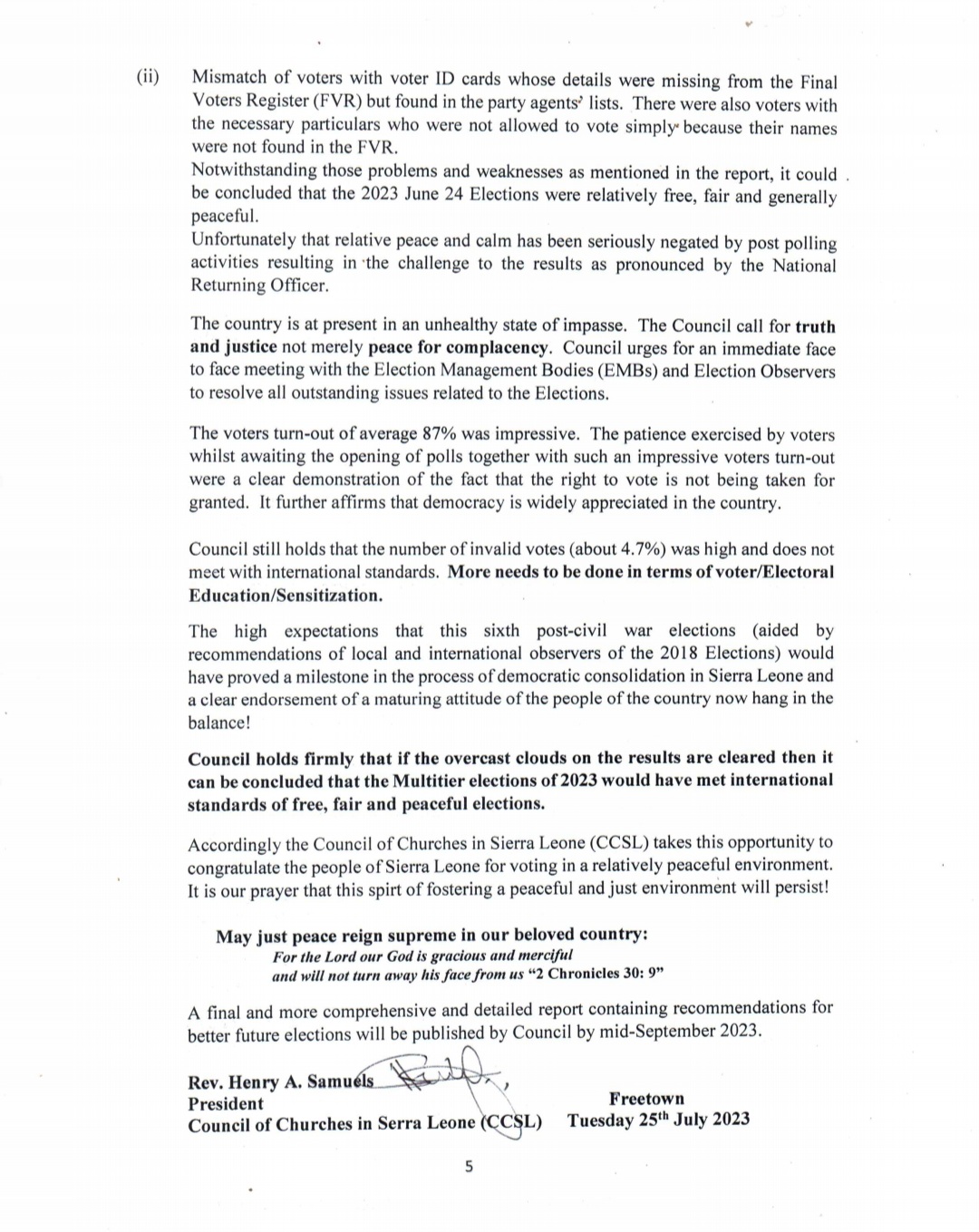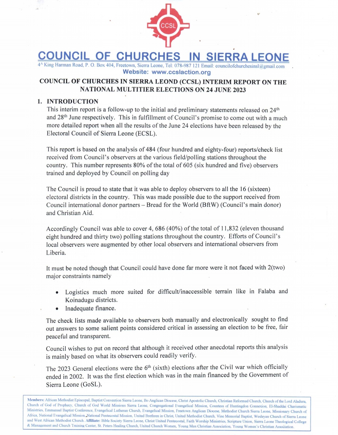 The Council of Churches in Sierra Leone (CCSL) has released an interim report on the 2023 National Multitier Elections held on June 24. This report follows initial statements released on June 24 and June 28.