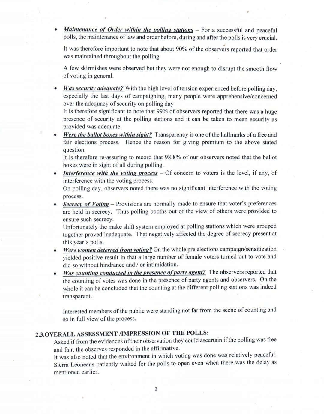 The interim report concludes that, despite some challenges, the 2023 June 24 Elections were relatively free, fair, and peaceful. The Council of Churches in Sierra Leone urges a face-to-face meeting with the Election Management Bodies and Election Observers to address outstanding issues related to the Elections.