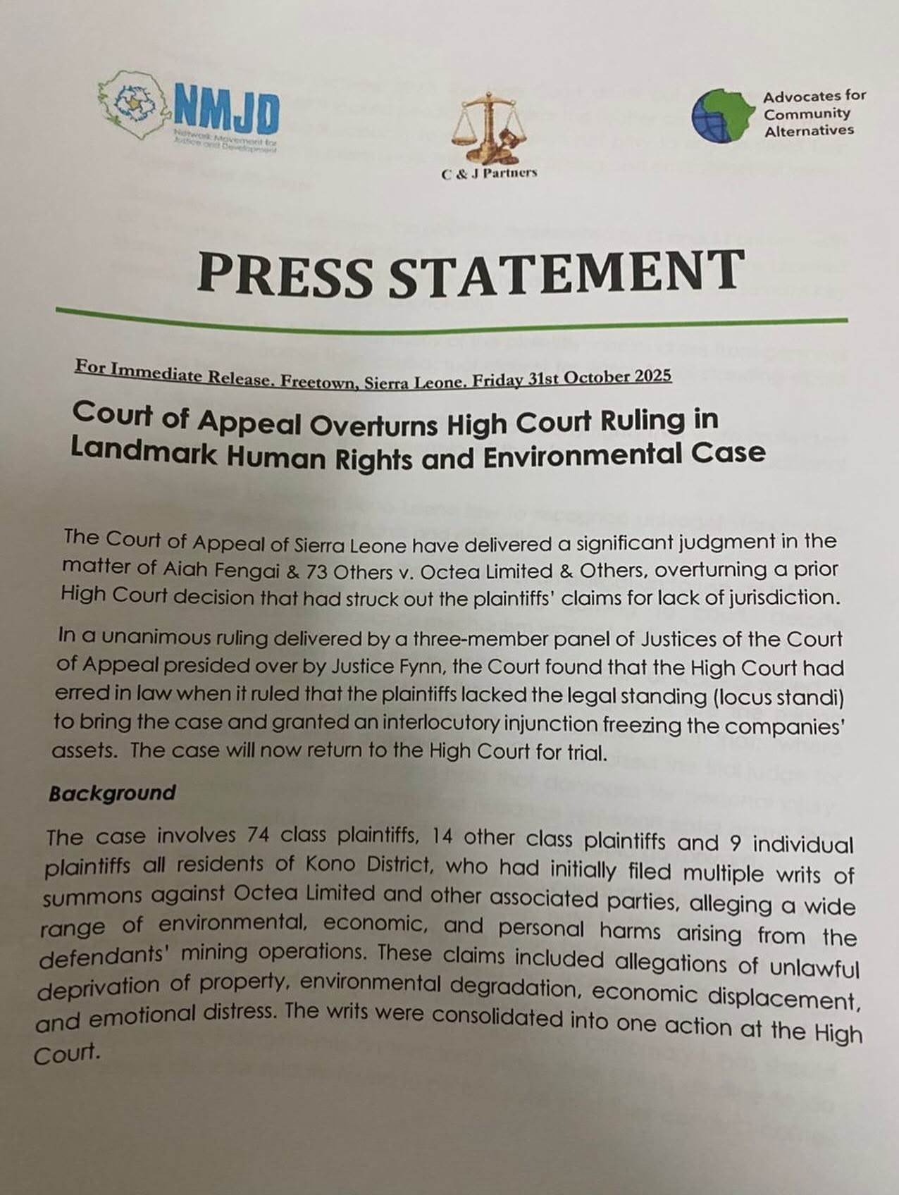 Sierra Leone Court of Appeal, through a press statement dated, Friday 31st of october, 2025, has judge the matter of Aiah Fengai & 73 Others v. Octea Limited & Others.