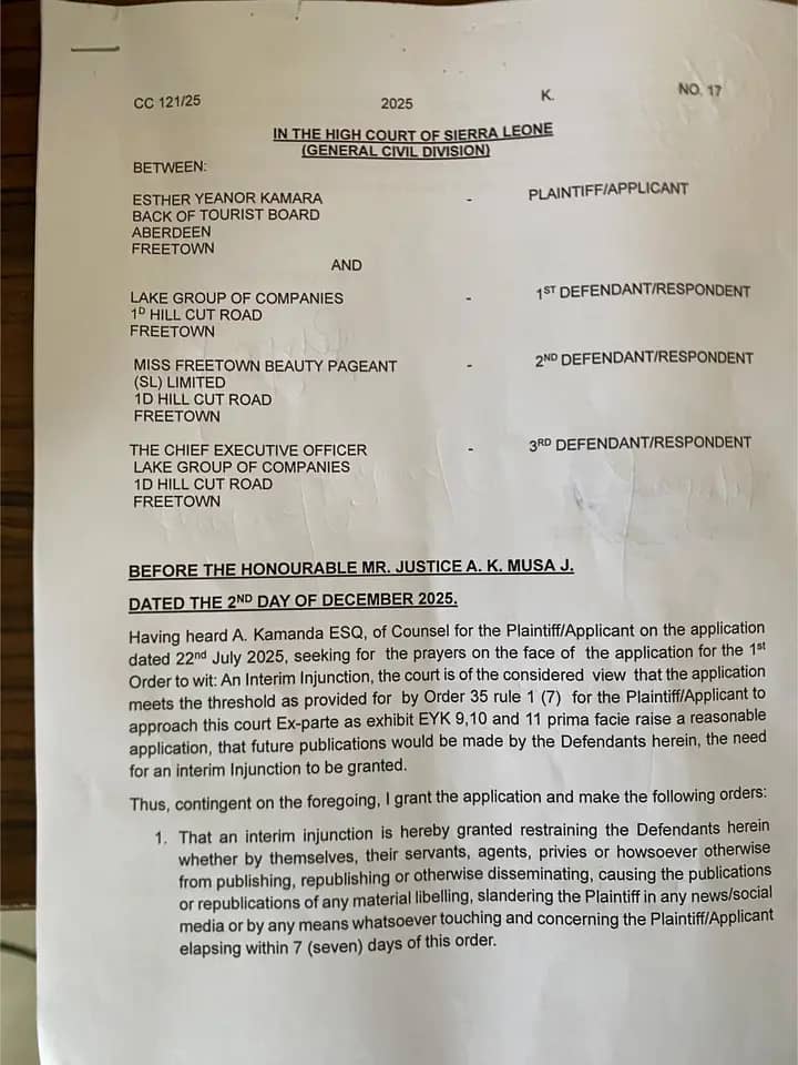 The High Court of Sierra Leone, General Civil Division, has granted an interim injunction in a defamation case filed by Esther Yeanor Kamara against Lake Group of Companies, Miss Freetown Beauty Pageant (SL) Limited, and the Chief Executive Officer of Lake Group of Companies.