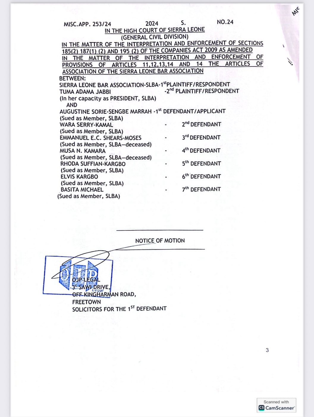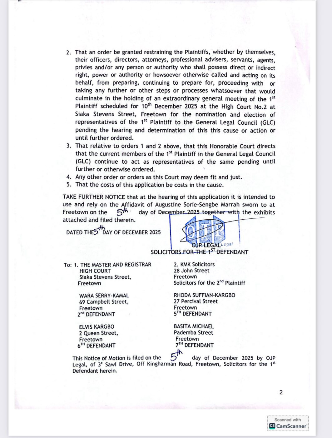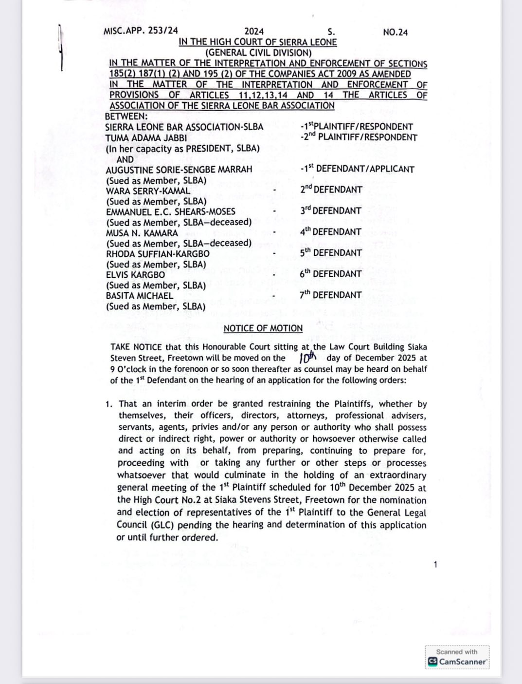 Procedural Dispute Stalls Application The legal challenge, brought by the 1st Defendant, Augustine Sorie-Sengbe Marrah, sought an interim order to restrain the SLBA and Tuma Adama Jabbi (the Plaintiffs) from holding the scheduled meeting. The application also sought to maintain the status quo by allowing current SLBA members in the General Legal Council to continue acting as representatives pending further court orders.