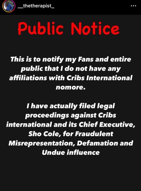 On Wednesday 28th December, 2022, The Therapist on one of his post disassociated himself from Cribs International and continued that he has taken legal actions against the label and the CEO, Sho Cole.
