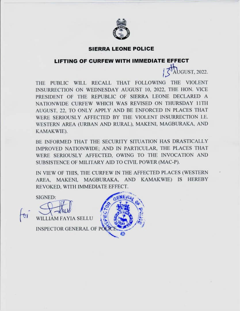 “The public will recall that following the violent insurrection on Wednesday August 10, 2022, the Hon. Vice President of the Republic of Sierra Leone declared a nationwide curfew which was revised on Thursday 11th August, 22, to only apply and be enforced in places that were seriously affected by the violent insurrection i.e. Western Area (urban and rural), Makeni, Magburaka, and Kamakwie).