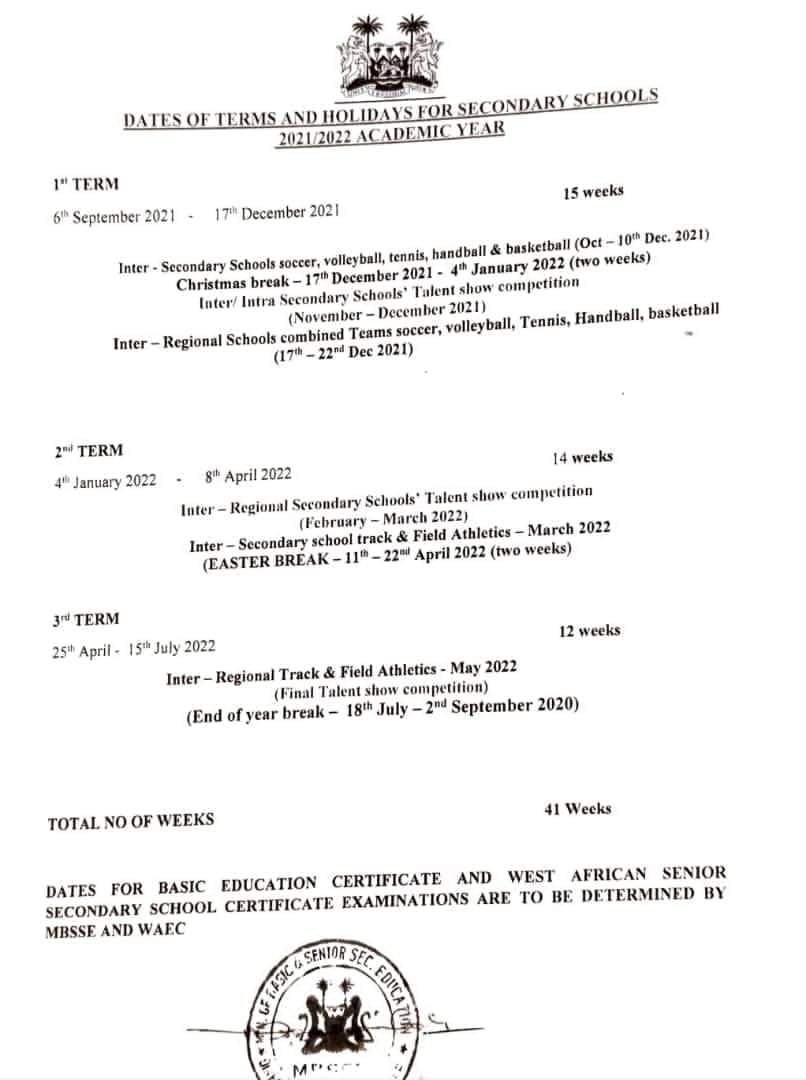 The Government of Sierra Leone through the Ministry of Basic and Senior Secondary School Education has announced dates for the 2021/2022 Academic Year’s Terms and Holidays for Secondary Schools in the country.