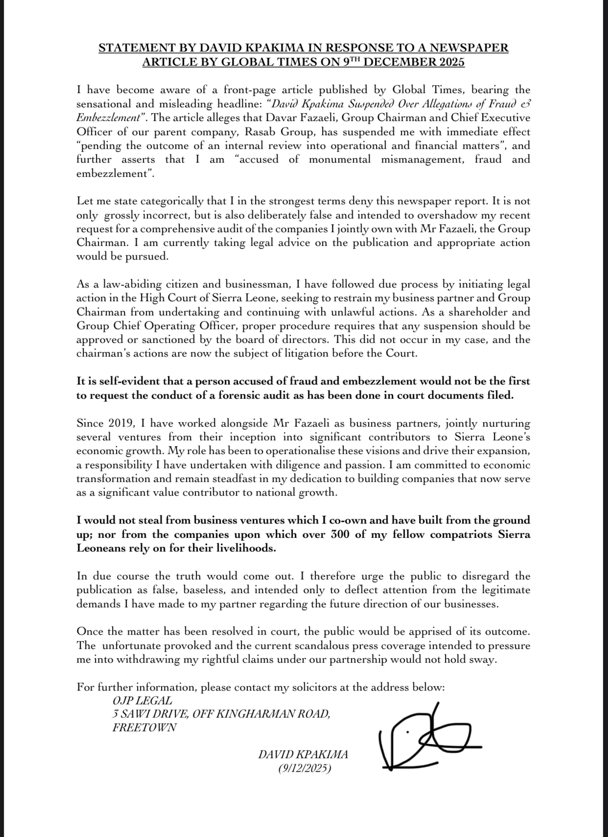 The full statement was issued on December 9, 2025, and Kpakima has advised anyone seeking further information to contact his legal representatives at OJP Legal in Freetown.