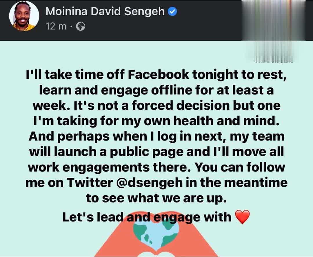 Before deactivating his Account minister sengeh writes that he is taking some time off to rest at least for a week, adding that It is not a Forced decision, but one he is taking for his health and mind.