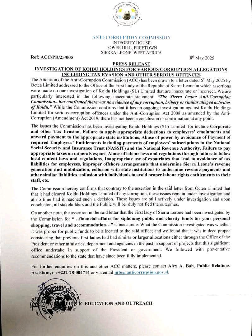 On 6th May 2025, Octea Limited sent a letter to the Office of the First Lady, stating that the ACC had found no evidence of corruption, bribery, or similar activities involving Koidu Holdings. The ACC responded, calling this assertion inaccurate and confirming that the investigation into Koidu Holdings is still in progress.