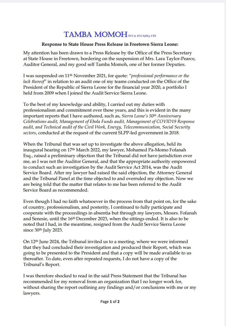 Sierra Leone’s Former Deputy Auditor General of Sierra Leone, Tamba Momoh, has issued a detailed response to a recent press release from the Office of the Press Secretary at State House.