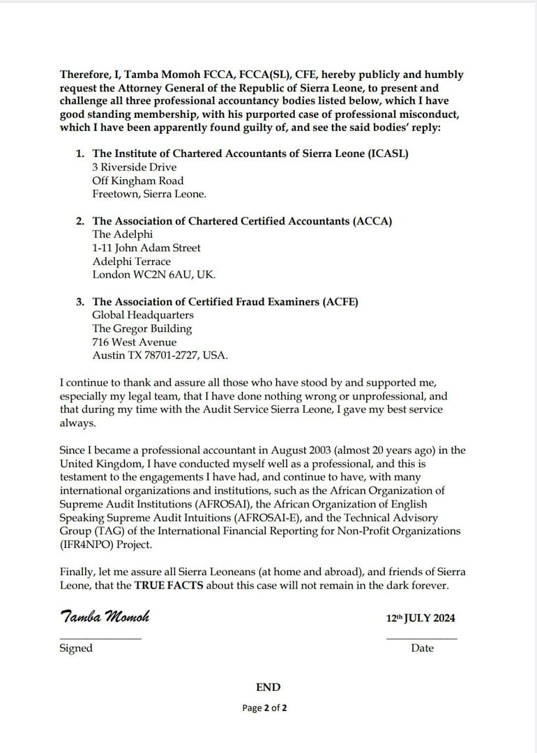 Expressing his shock at the Tribunal’s recommendation for his removal from an organization he no longer works for, Mr. Momoh has publicly requested the Attorney General to present the alleged case of professional misconduct to three prominent professional accountancy bodies: