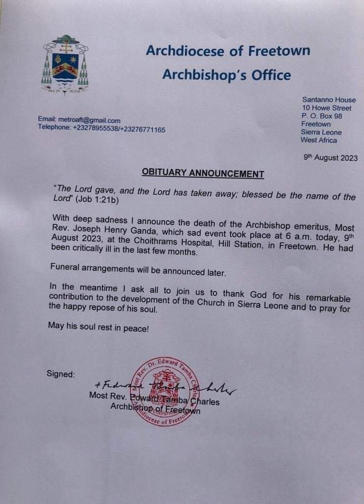 The Diocese of Freetown in a press release issued on the 9th of August 2023, has announced the passing of Archbishop Emeritus, Most Rev. Joseph Henry Ganda.