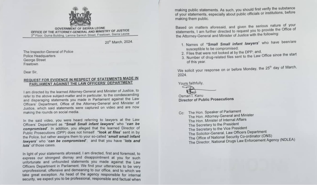 The letter concluded by setting a deadline for the Inspector General’s response, highlighting the seriousness of the matter and the urgency of a thorough investigation. The demand for evidence underscores the commitment of the DPP to uphold the integrity and professionalism of the legal system in Sierra Leone.