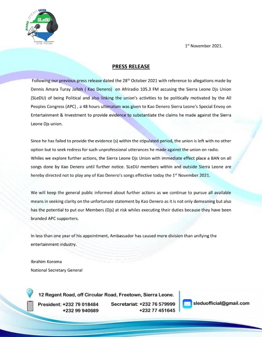 However, Sierra Leone DJs Union did a press release on 28th October, 2021 giving 48 hours ultimatum to Kao Denero to provide evidences of all the accusations he made against the Union.