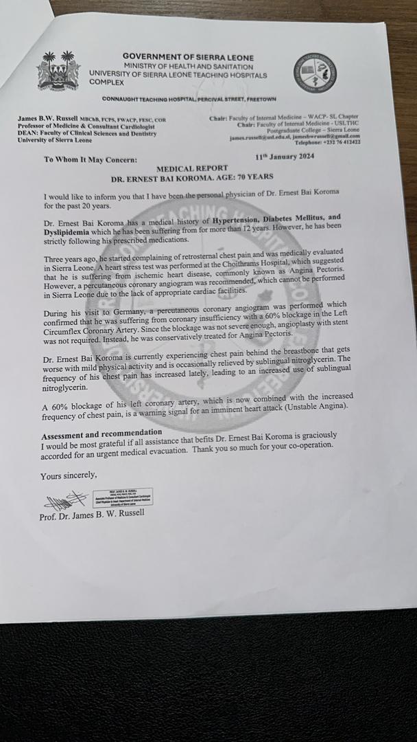 According to the document written by renowned cardiologist Dr. Jibao Russell, over the last three years, former President Koroma has been battling with hypertension, diabetes and cardiac problems. But over the last two months since his alleged involvement in a coup, his health condition has worsened.