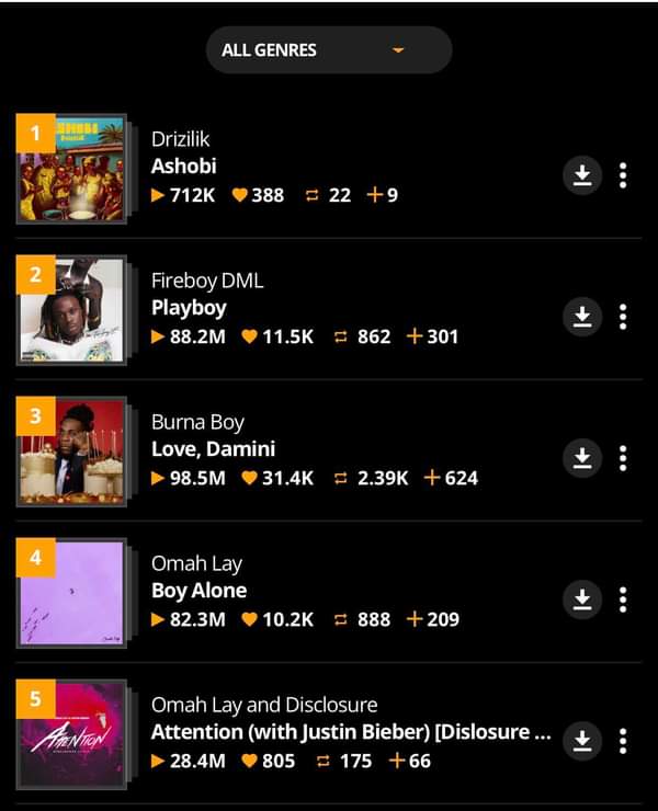 Yesterday on his official page, Drizilik sends messages to Nigerian celebrities to let his Ashobi songs top the chart including Fireboy DML. Few hours after his post, the Ashobi song has topped Audiomack streaming app songs chart.