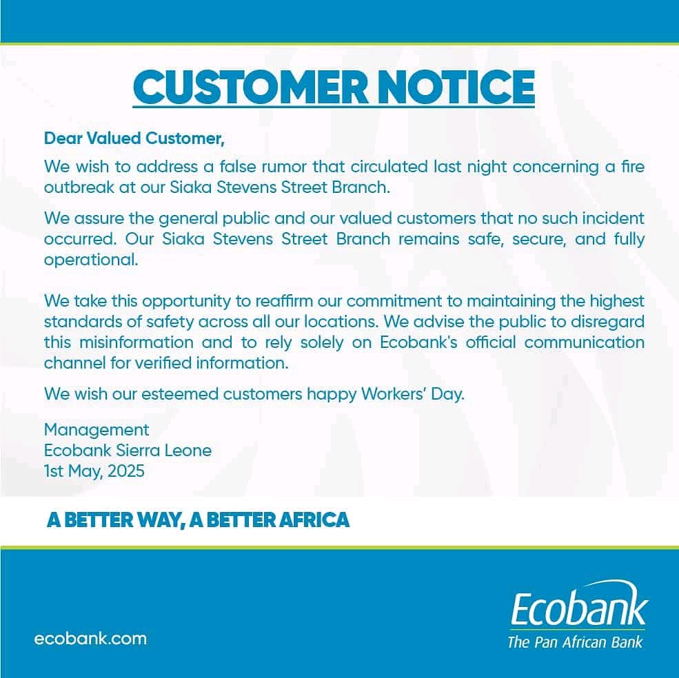 The notice, released today, Thursday 1st May 2025 stated that the Siaka Stevens Street branch is safe, secure, and fully operational. Ecobank urged the public to disregard the misinformation and to rely on its official communication channels for accurate updates.