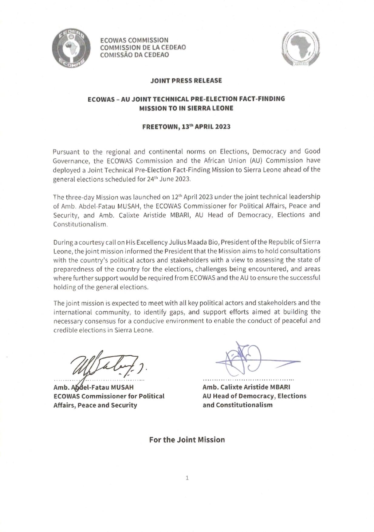 The Economic Community of West African States (ECOWAS) and the African Union have deployed a joint technical pre-electoral fact-finding mission in Sierra Leone based on regional and continental electoral criteria.