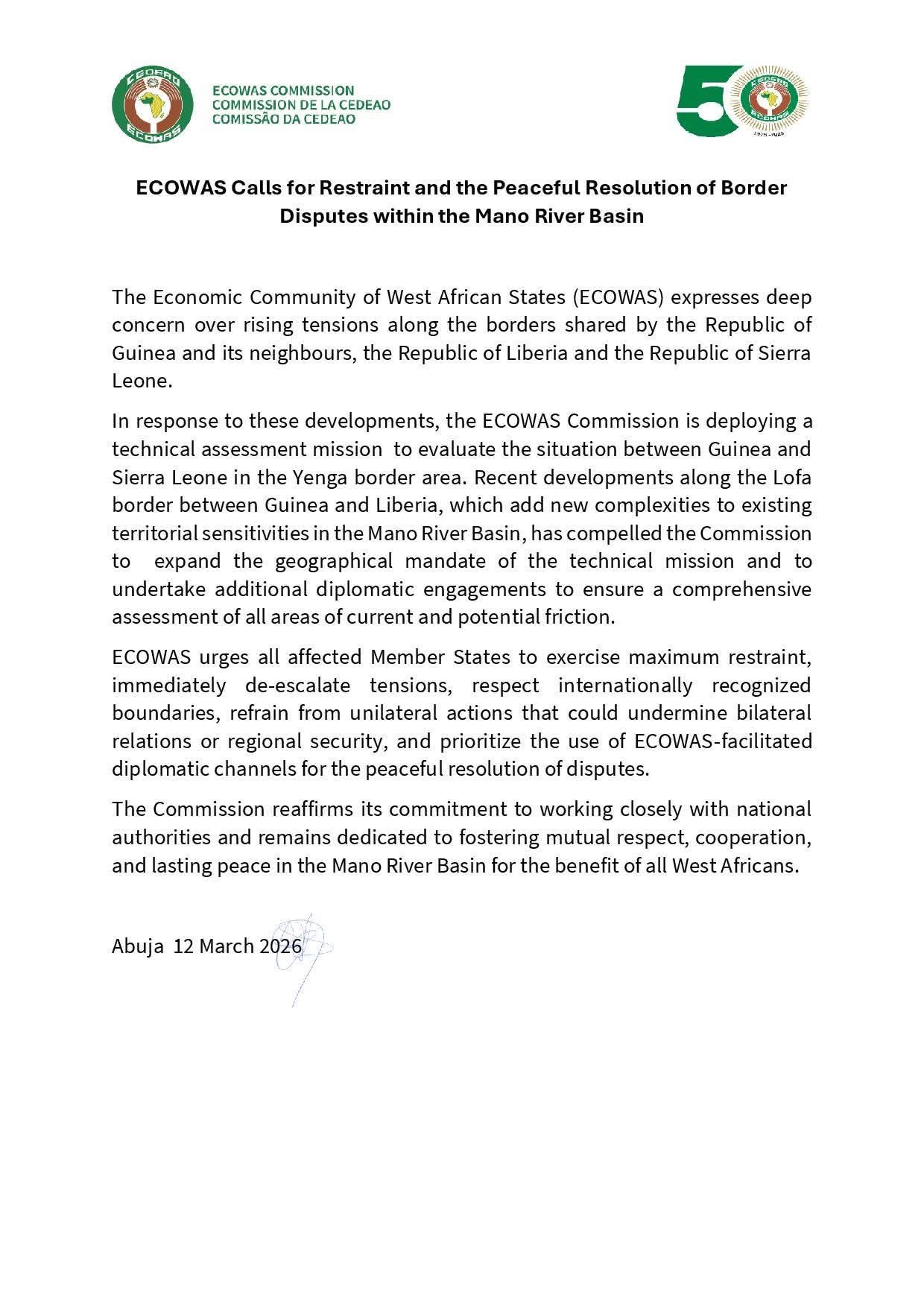 Reaffirming its commitment to regional stability, the Commission stated it will continue to work closely with national authorities to foster mutual respect, cooperation, and lasting peace in the Mano River Basin, for the benefit of all West Africans.