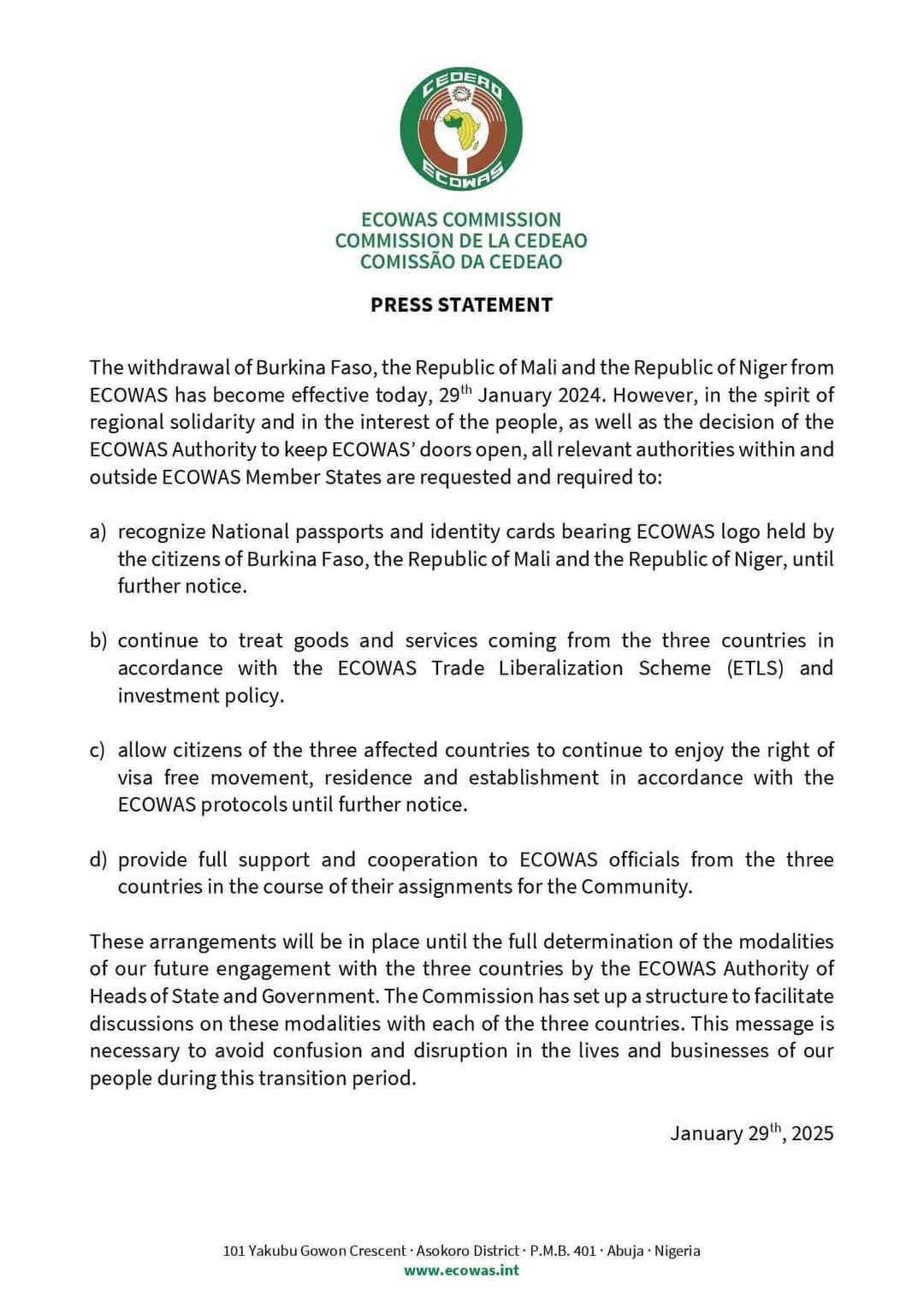 In a press statement issued on 29th January 2025, the ECOWAS Commission outlined key provisions to maintain continuity in travel, trade, and diplomatic engagements.