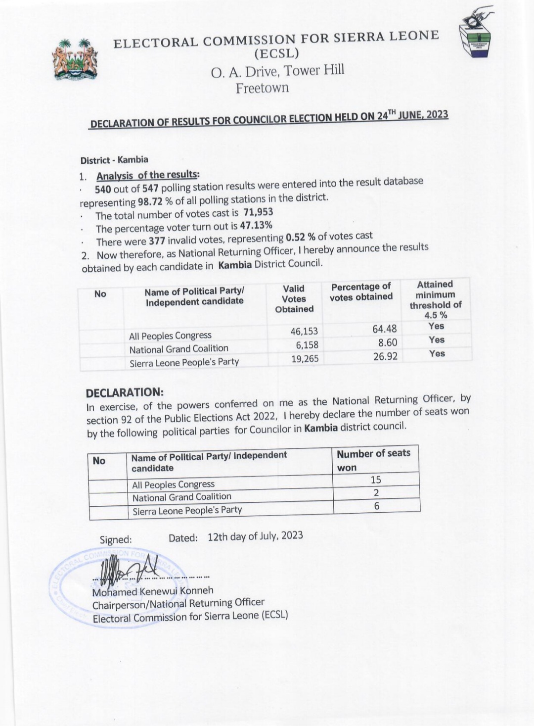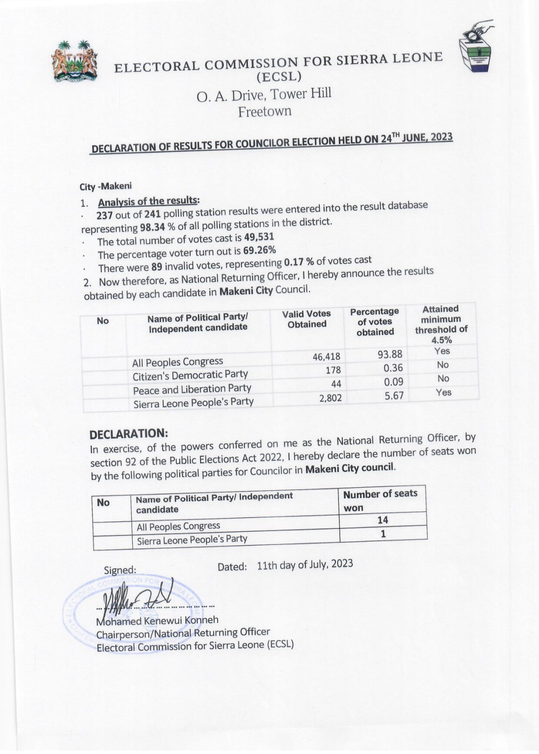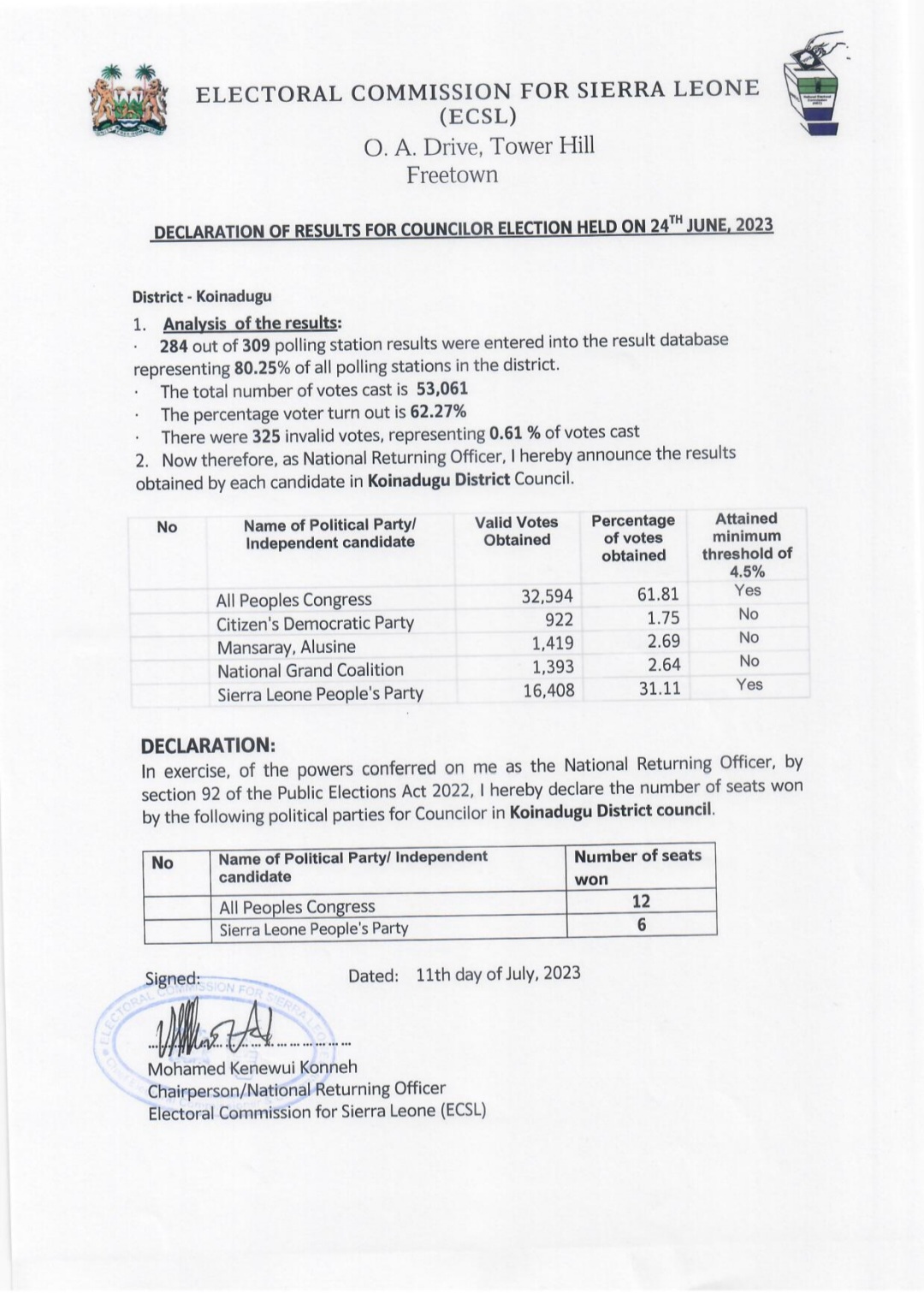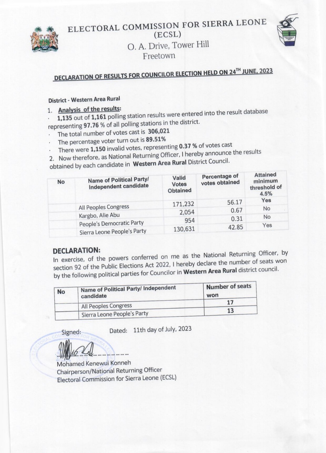 Today, the Electoral Commission for Sierra Leone (ECSL) revealed the long-awaited results of the councilor election that took place on June 24th, 2023.