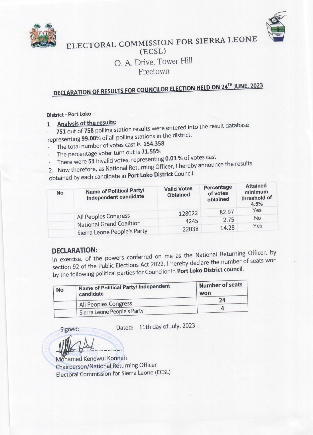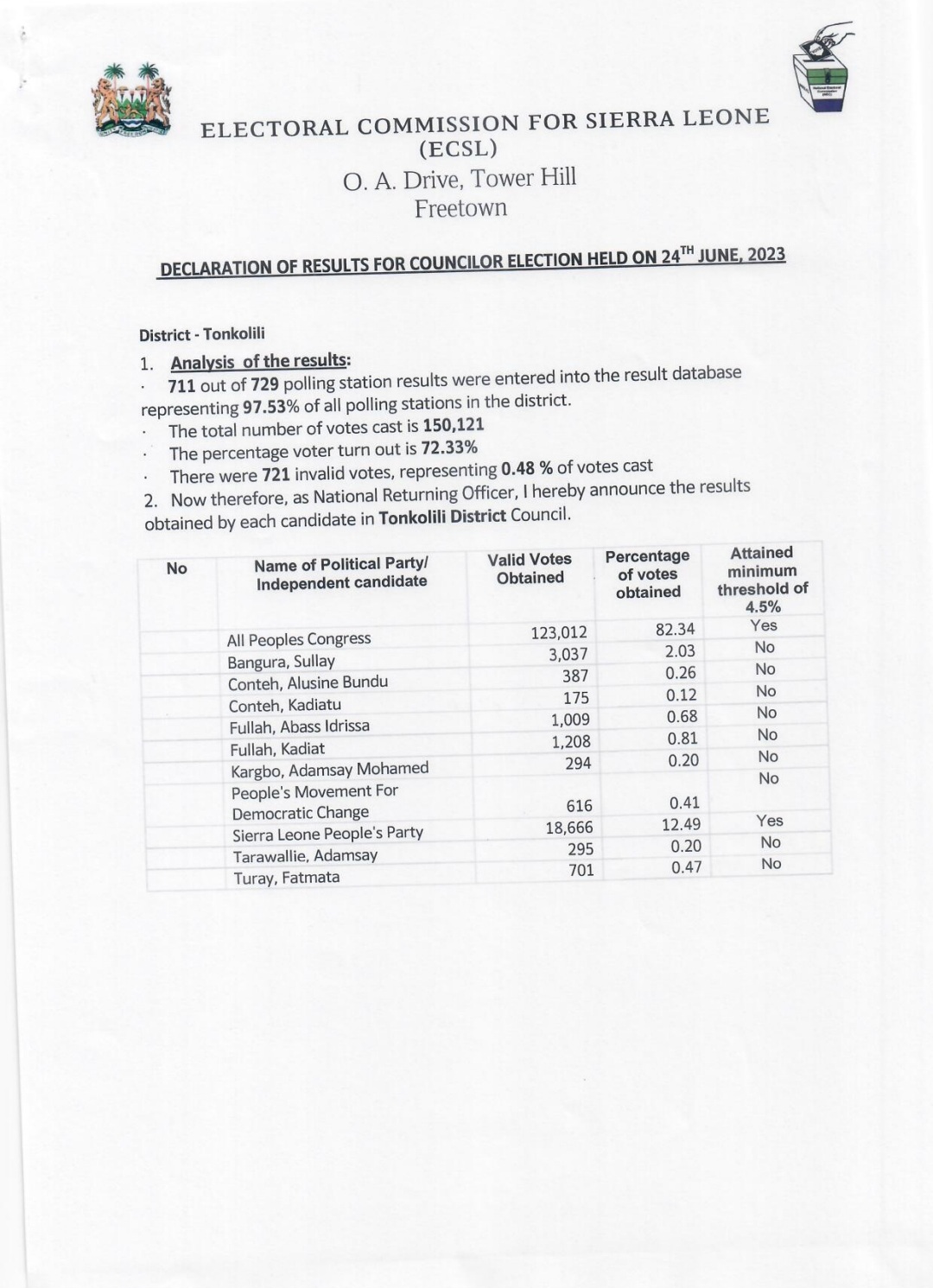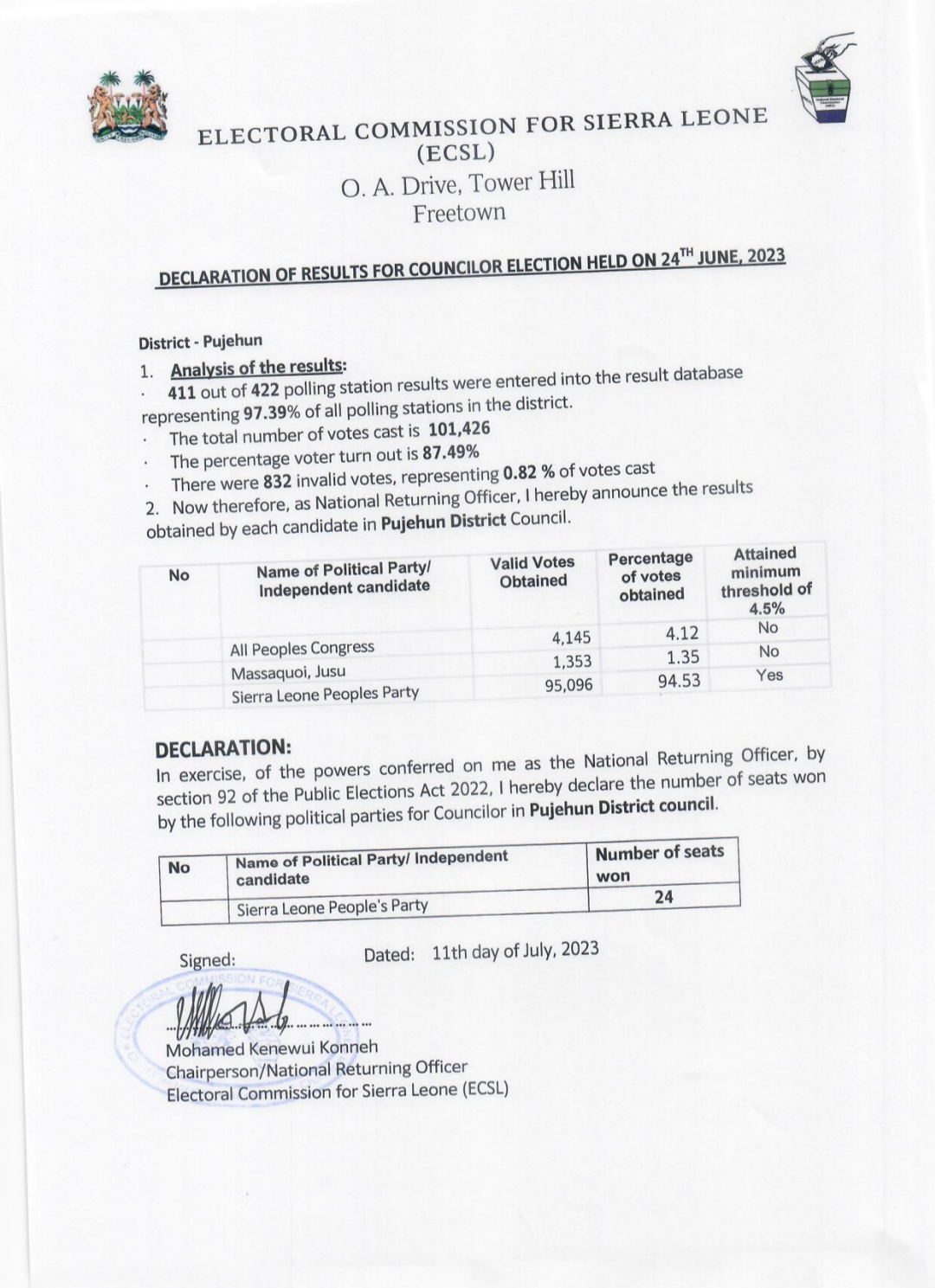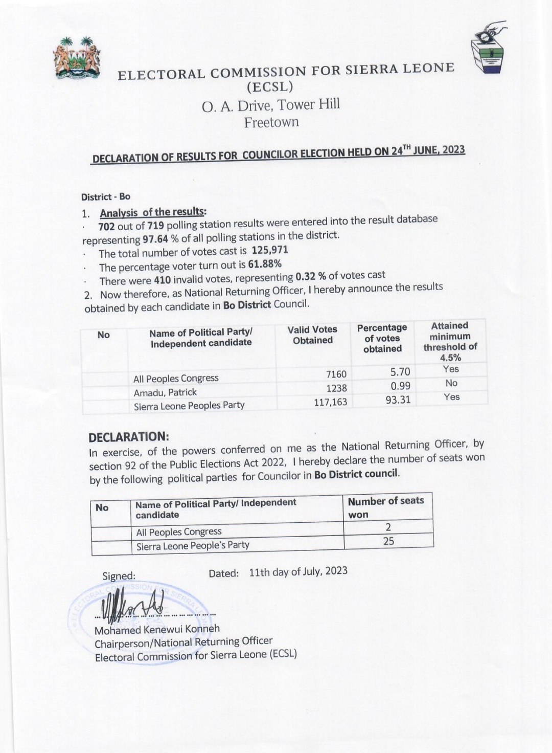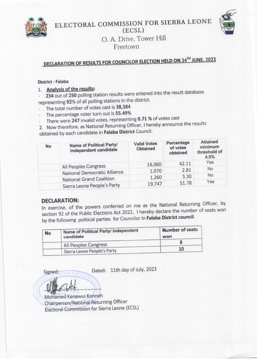 Today, the Electoral Commission for Sierra Leone (ECSL) revealed the long-awaited results of the councilor election that took place on June 24th, 2023.