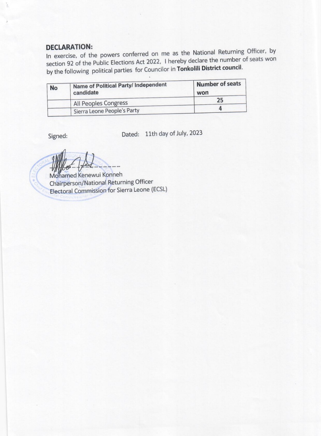 The announcement was made by the National Returning Officer, Mohamed Konneh, at the ECSL headquarters in Freetown.