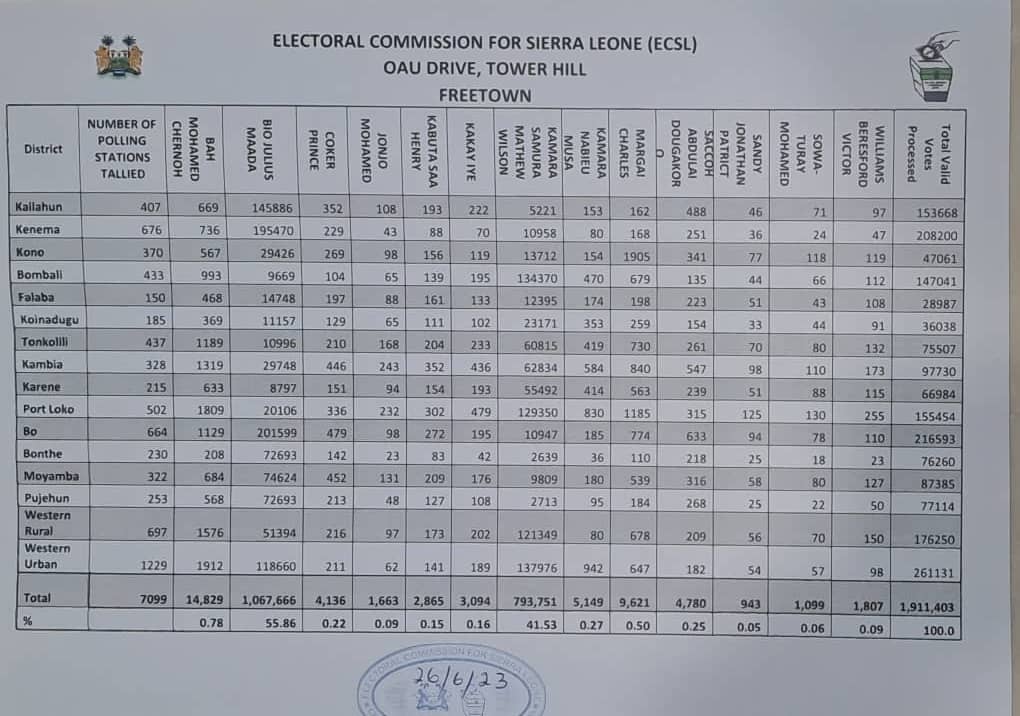 These results, which accounted for 60 percent of the total polling stations, were processed and cleared by the Electoral Commission for Sierra Leone (ECSL) Result Management systems. The data was tabulated at Regional Tally Centres located in Freetown, Bo, Kenema, Makeni, and Port Loko.