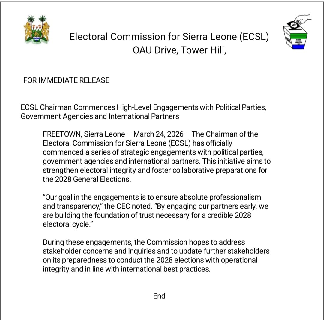 The Chairman of the Electoral Commission for Sierra Leone (ECSL) has officially commenced a series of high-level strategic engagements with political parties, government institutions, and international partners aimed at strengthening electoral integrity ahead of the 2028 General Elections.