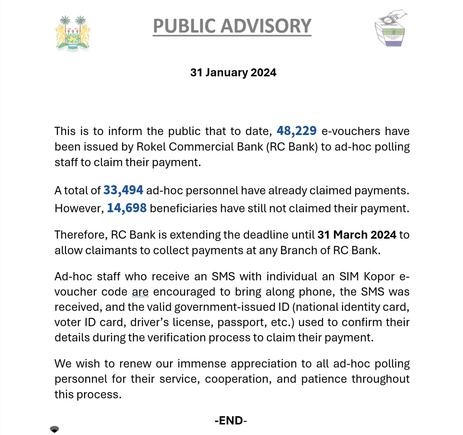 The notice indicates that Rokel Commercial Bank (RC Bank) has issued 48,229 e-vouchers to ad-hoc polling staff for payment claims. Of these, 33,494 ad-hoc personnel have successfully claimed their payments. However, a significant number of beneficiaries, totaling 14,698, have yet to claim their payments.