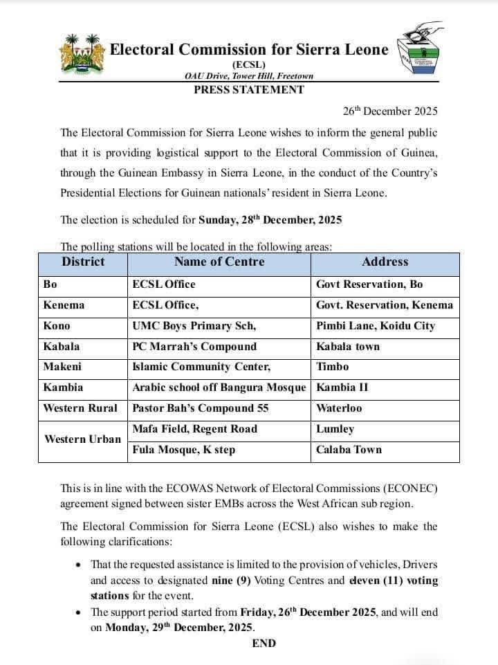 According to a press statement dated 26 December 2025, the support is being provided through the Guinean Embassy in Sierra Leone and is in line with regional cooperation agreements among electoral management bodies within the West African sub-region.