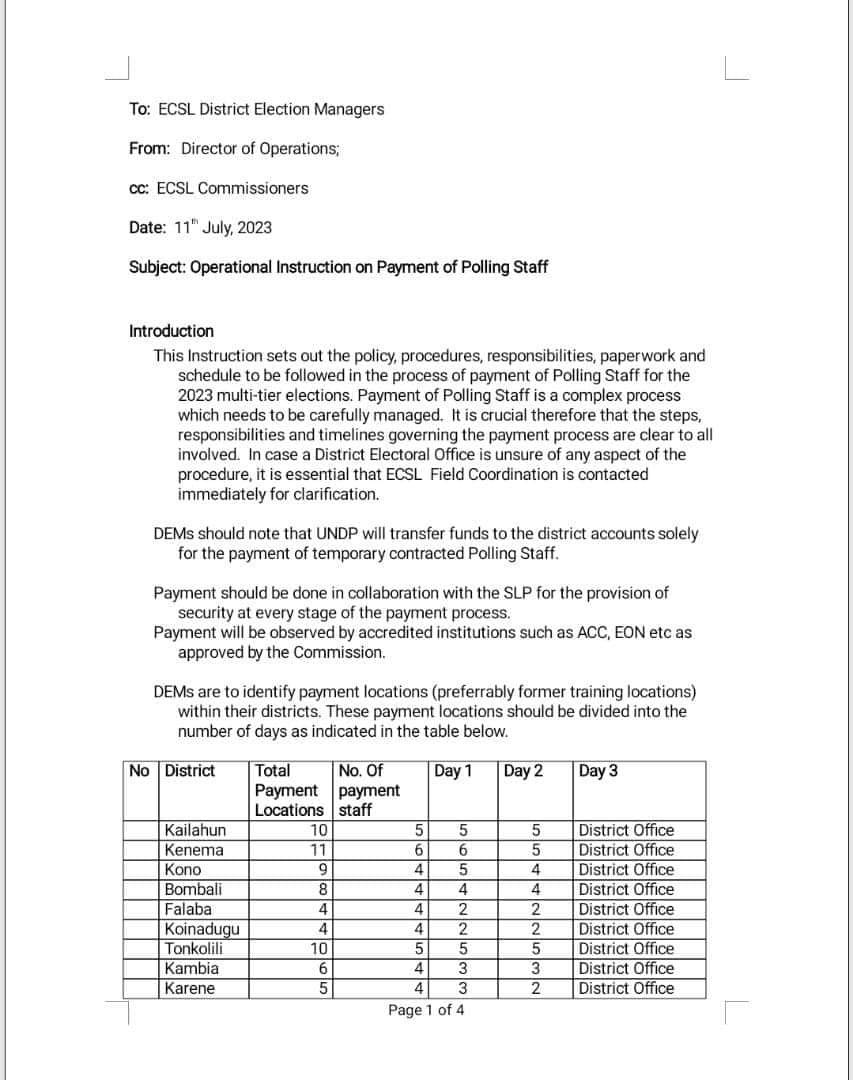 The Electoral Commission for Sierra Leone (ECSL) said today, Wednesday July 12, in a press statement publishes Operational Instructions on the payment of Polling Staff that were working for the commission before during and after the 2023 multi-tier elections.