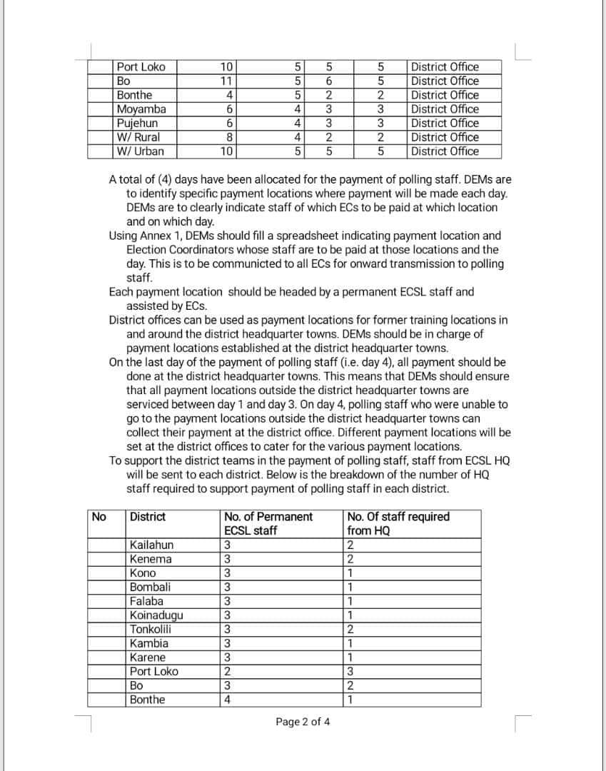 The statement also made mentioned of how the payment will go noting that “DEMs should note that UNDP will transfer funds to the district accounts solely for the payment of temporary contracted Polling Staff. Payment should be done in collaboration with the SLP for the provision of security at every stage of the payment process. Payment will be observed by accredited institutions such as ACC, EON, etc, as approved by the Commission. DEMs are to identify payment locations (preferrably former training locations) within their districts. These payment locations should be divided into the number of days as indicated in the table below.”