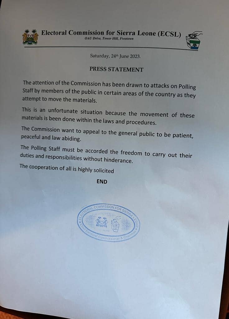 The Electoral Commission for Sierra Leone (ECSL) has issued a statement expressing concern over the reported incidents of attacks on their polling staff across the country.