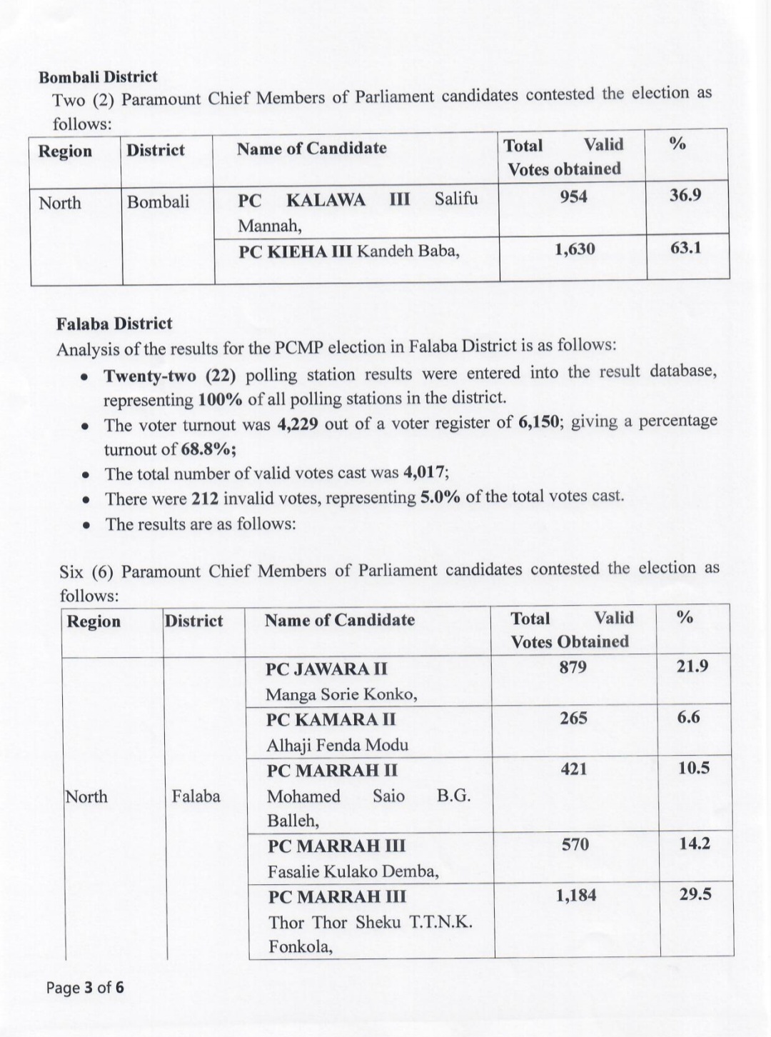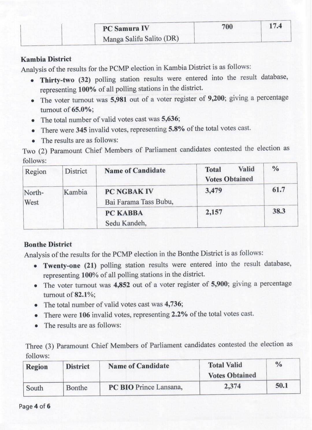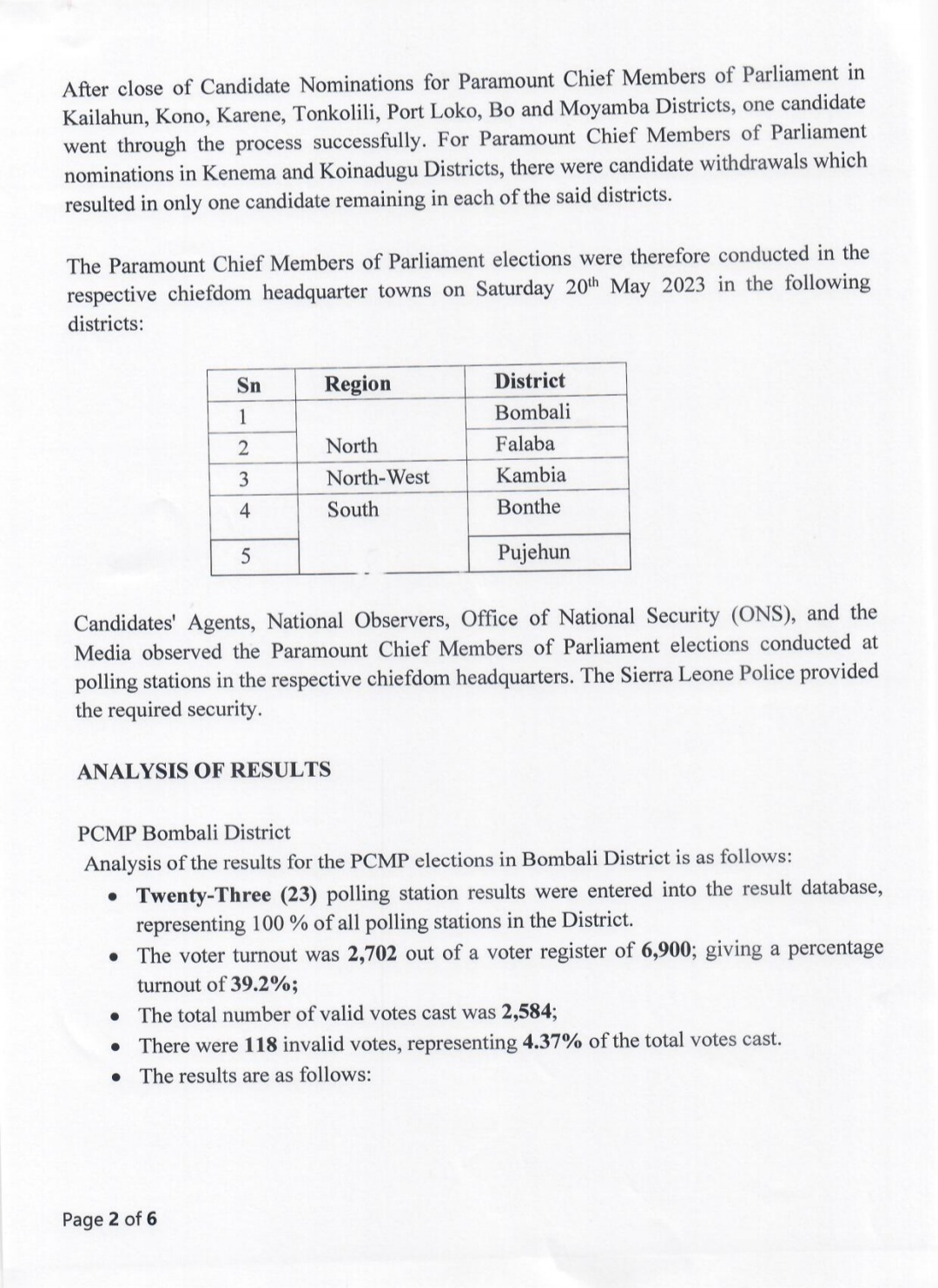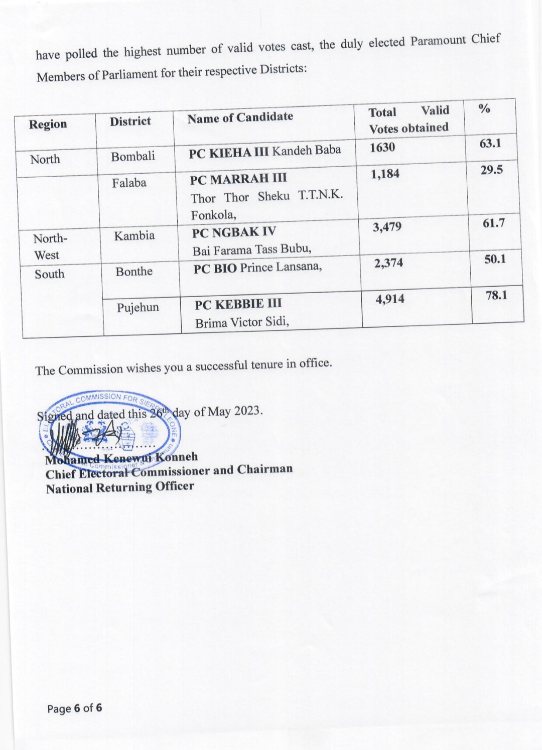The Electoral Commission for Sierra Leone (ECSL) has officially announced the results of the Paramount Chief Members of Parliament (PCMP) elections held on Saturday, May 20, 2023.