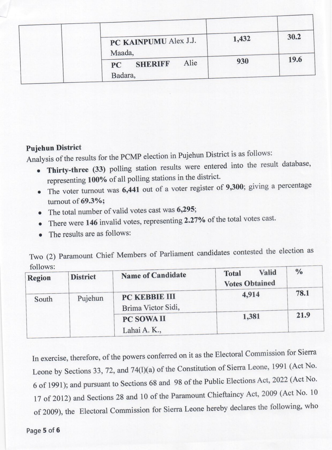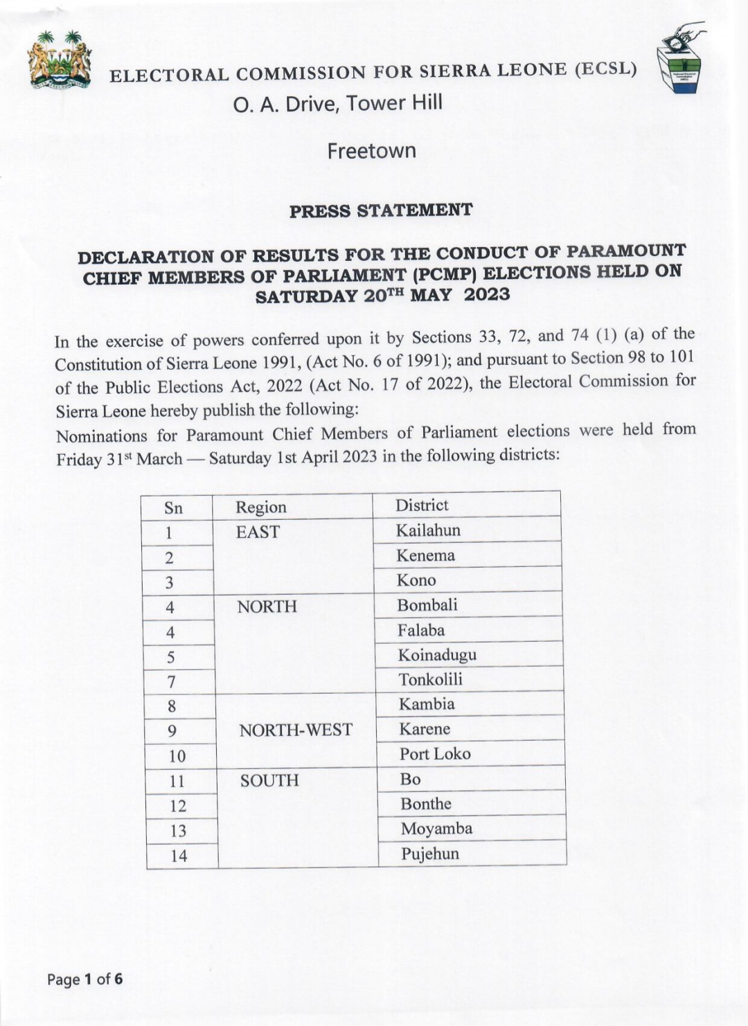 This declaration comes after the exercise of powers vested in the Commission by the Constitution of Sierra Leone 1991 and the Public Elections Act, 2022.