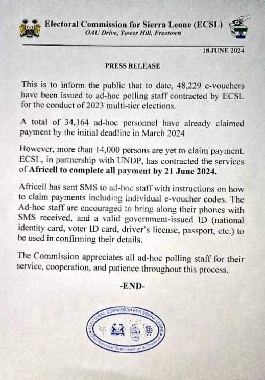 In a recent press release dated June 18, 2024, the Electoral Commission for Sierra Leone (ECSL) has provided an update on the disbursement of payments to ad-hoc polling staff engaged for the 2023 multi-tier elections.