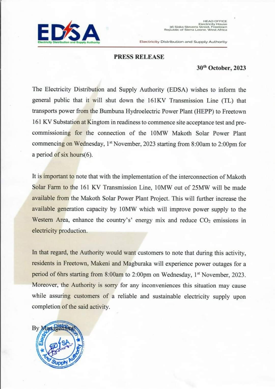 The Electricity Distribution and Supply Authority (EDSA) wishes to inform the general public that it will shut down the 161KV Transmission Line (TL) that transports power from the Bumbuna Hydroelectric Power Plant (HEPP) to Freetown 161 KV Substation at Kingtom in readiness to commence site acceptance test and pre- commissioning for the connection of the 10MW Makoth Solar Power Plant commencing on Wednesday, 1″ November, 2023 starting from 8:00am to 2:00pm for a period of six hours(6).