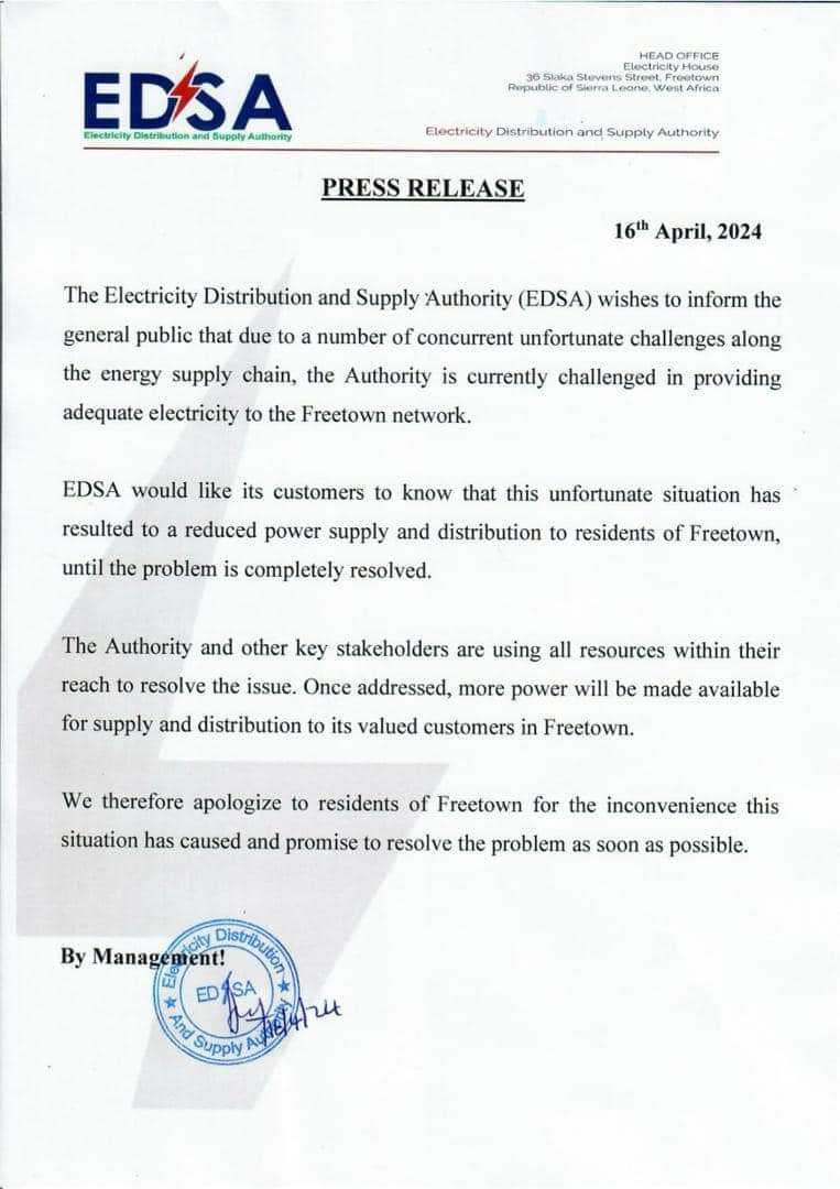 The Electricity Distribution and Supply Authority (EDSA) has announced, in a press release, the reasons for the continuous power outages throughout Freetown