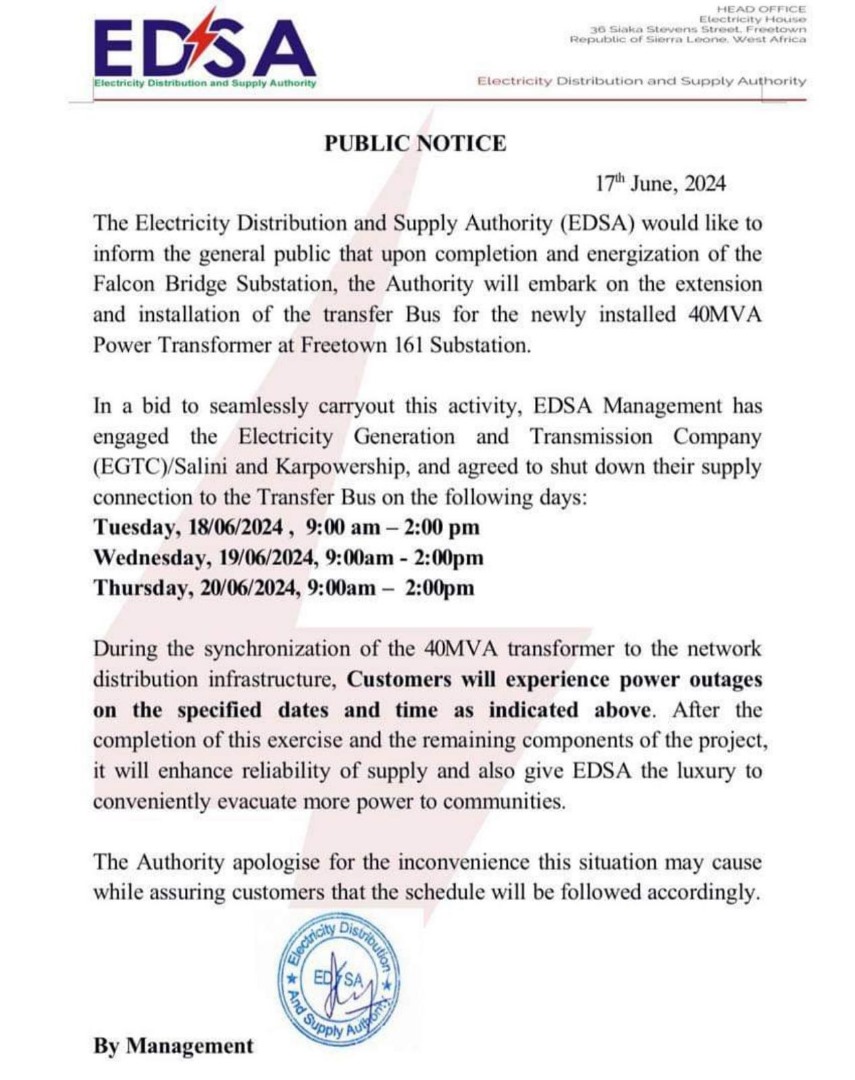 The Electricity Distribution and Supply Authority (EDSA) announced today that they will be carrying out planned power outages to facilitate the extension and installation of a transfer bus for a new transformer at the Freetown 161 Substation.
