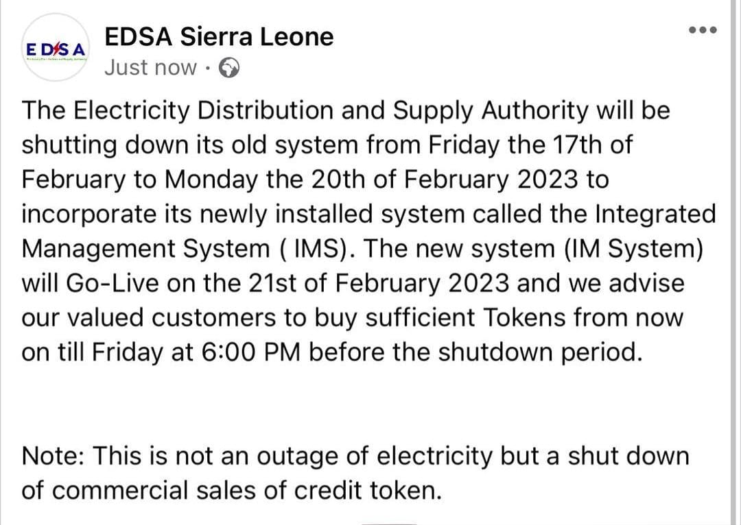 “The new system (IMS) will Go-Live on the 21st of February 2023 and we advise our valued customers to buy sufficient Tokens from now on till Friday at 6:00 PM before the shutdown period,” EDSA states.