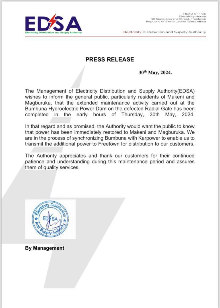 In a press release issued today, EDSA’s management highlighted the completion of the maintenance activities and reassured the public about the steps being taken to enhance the power distribution network. The authority is in the process of synchronizing Bumbuna’s operations with Karpower, a strategic move designed to transmit additional power to Freetown. This synchronization is expected to bolster the electricity supply to the capital city, thereby improving the overall stability and availability of power to customers.