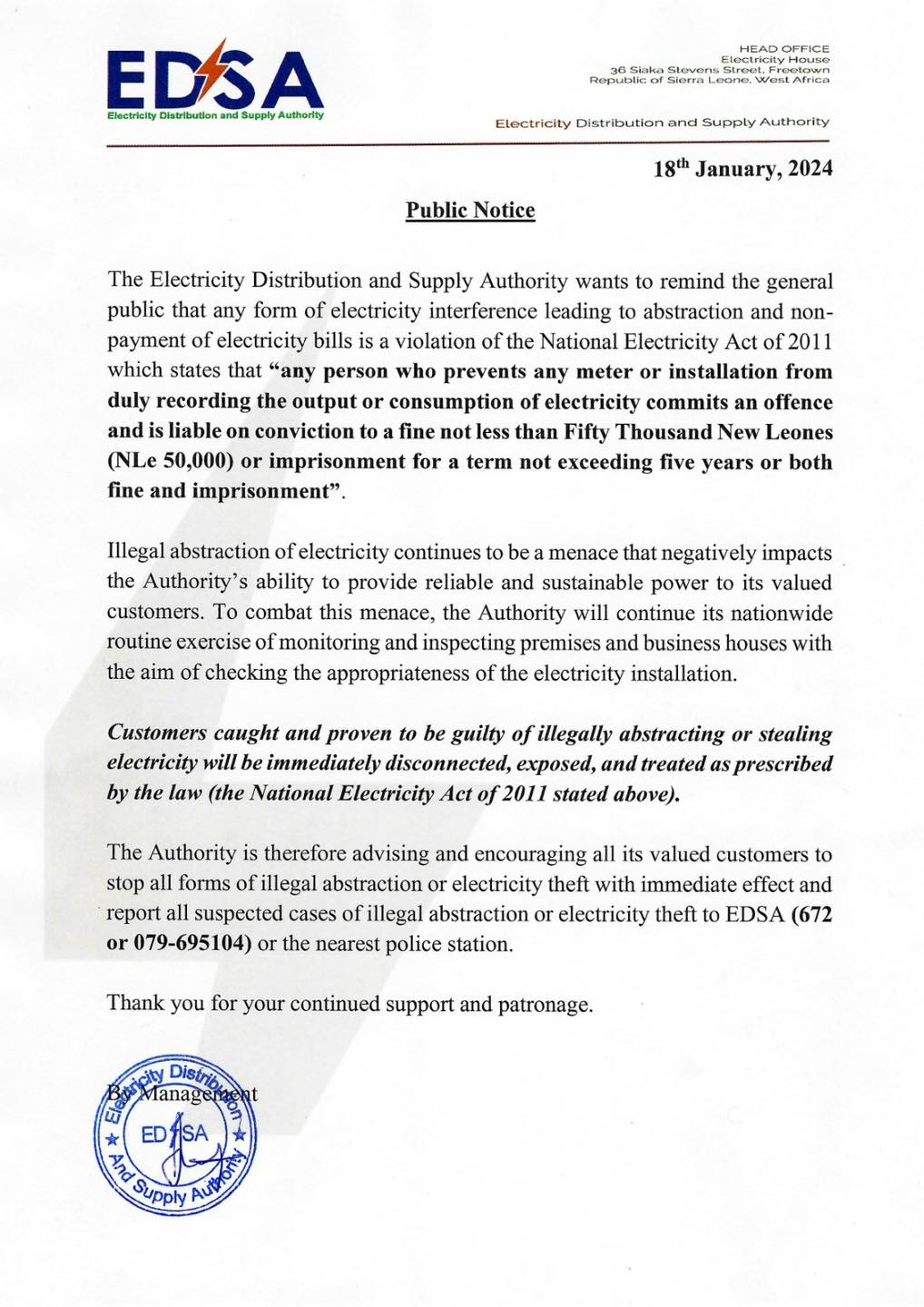 Citing the National Electricity Act of 2011, EDSA stressed that tampering with electricity meters or installations is a crime punishable by a fine of at least 50,000 Leones or imprisonment, or both.